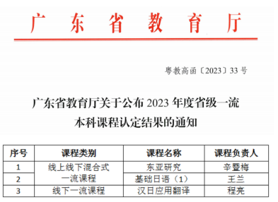 近日,广东省教育厅公布《广东省教育厅关于公布2023年度省级一流本科课程认定结果的通知》(粤教高函〔2023〕33号),我院一流课程建设成效实现新突破,共有3门课程入选广东省一流本科课程。其中,省级线上线下混合式一流课程2门,线下一流课程1门。近3年来,我院累计获得省级一流课程6门。