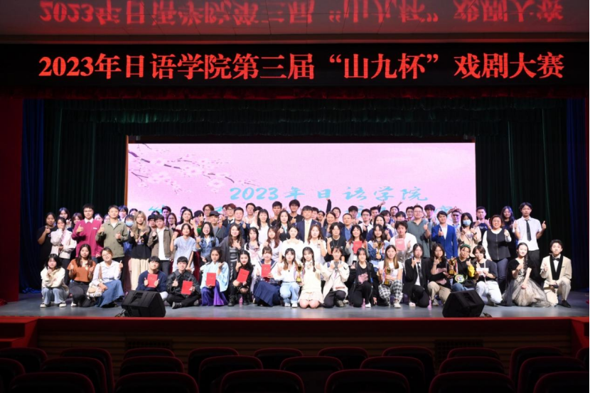 本网讯 11月24日晚,日语语言文化学院第三届“山九杯”戏剧大赛在第六教学楼报告厅举行。出席本次戏剧大赛的领导和嘉宾有:日语学院院长杨晓辉,党委书记周秀娇,副院长程亮,党委副书记连勇,广州山九物流有限公司总经理石井寿亲及行政管理统括部部长姜春奕。