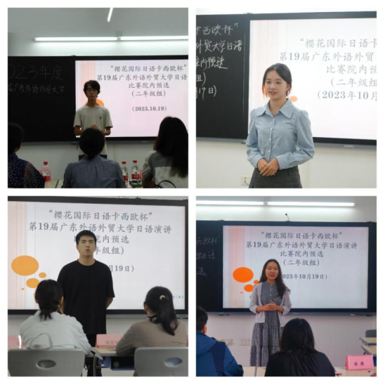 在以赛促学、以学促知、以知促行方面,学院开展形式多样的学科竞赛活动。10月19日下午,“樱花国际日语·卡西欧杯”日语演讲比赛院内预选赛在一教南楼401-404举行。本次演讲比赛采用命题演讲的形式,题目为“我始终如一的坚持”“我的挑战”。比赛过程中,选手们充分展现了自己的日语实力和语言表达能力,得到了评委们的高度评价。此次活动不仅展示了广外日语学子优秀的日语能力以及专业素养,还进一步激发了同学们对日语的学习热情。