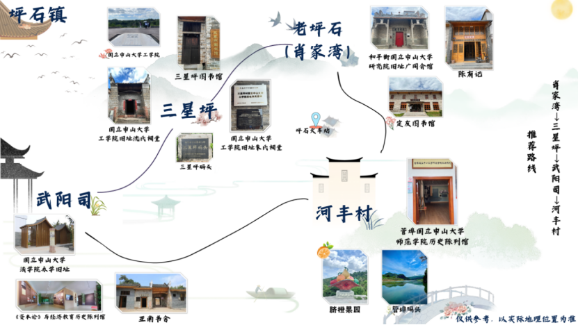 坪石小生实践团分工明确,稳步推进工作。摄影组在一周的实地考察里,拟定视频脚本,积极构思旅游宣传视频,深度挖掘华南研学基地的特色景点;文创设计组前往各个村落进行调研考察、整理相关资料和文献、不断挖掘坪石镇的特色,宣传华南研学基地的红色历史背景。同时设计出“坪石先生”的人物形象,并且帮助该基地研发其它相关的文创周边,帮助研学基地增加收入,旨在以旅游经济拉动整体经济;旅游路线设计组通过实地调研,整合华南研学基地中河丰村、三星坪村、肖家湾村和武阳司村四地的学校旧址资源,设计出一条完整的旅游推荐路线。