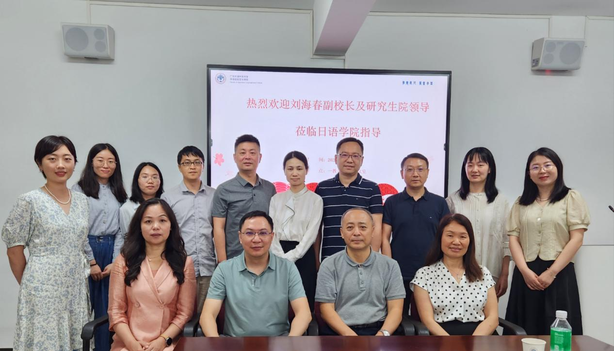5月22日下午,校党委常委、副校长刘海春带领研究生院院长杨励一行8人到我院开展调研,调研内容包括我院翻译专业学位点、日语语言文学学位点的建设情况以及研究生国际化项目的推进情况等。我院院长杨晓辉、学院党委书记周秀娇、副院长程亮、党委副书记连勇、国际交流员邓宇阳及研究生办公室秘书于贺珍参加会议。