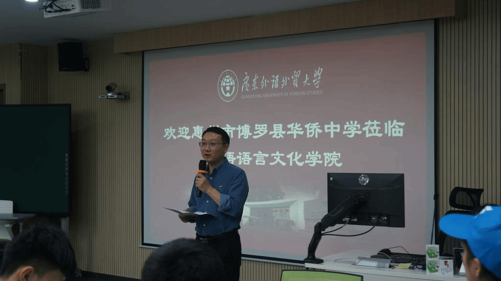 本网讯 4月22日上午,惠州市博罗县华侨中学高二年级80余名师生来我校白云山校区参观研学。日语学院党委书记周秀娇、学校教务部副部长邓丽君、副院长程亮、党委副书记连勇、辅导员朱浩文以及10余名志愿者热情接待了来访师生。