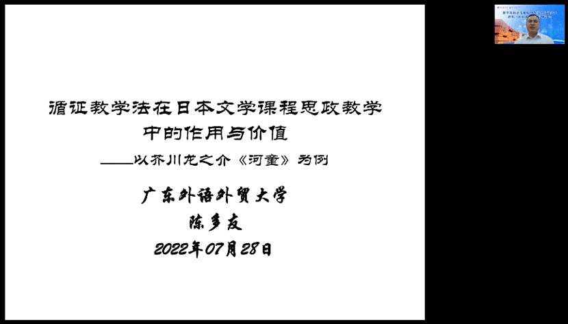 广东外语外贸大学陈多友教授则主要聚焦芥川龙之介著名短篇小说《河童》的课堂教学,阐述了循证教学方法在日本文学课程思政教学中的作用与价值。首先,陈多友对“循证教育学”之“哈格利乌斯循证教育基本模型”等理论模型进行了简明扼要的介绍,指出采用该方法开展文学课程思政教学,具有科学性、现实性和实效性。接着,他演绎了文学课程思政教学过程中循证策略展开的步骤与策略。最后,他以极富中日比较文化比较文学张力的《河童》为例,进行了实战演示。藉此,向与会者诠释了理论创新在文学课课程思政教学中的重大作用与价值,极具深远的启发意义。