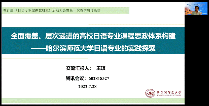 哈尔滨师范大学王琪教授介绍了哈师大日语专业在课程思政建设方面的丰富经验。她认为哈师大日语专业在课程思政建设过程中呈现出了全面覆盖、层次递进的特点。除了分享相关的经验与举措,王琪教授还指出了当前哈师大日语专业在课程思政建设方面所遇到的问题与挑战,发人深省。