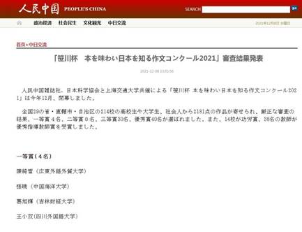 1.人民中国官网:「笹川杯 本を味わい日本を知る作文コンクール2021」審査結果発表(peoplechina.com.cn)