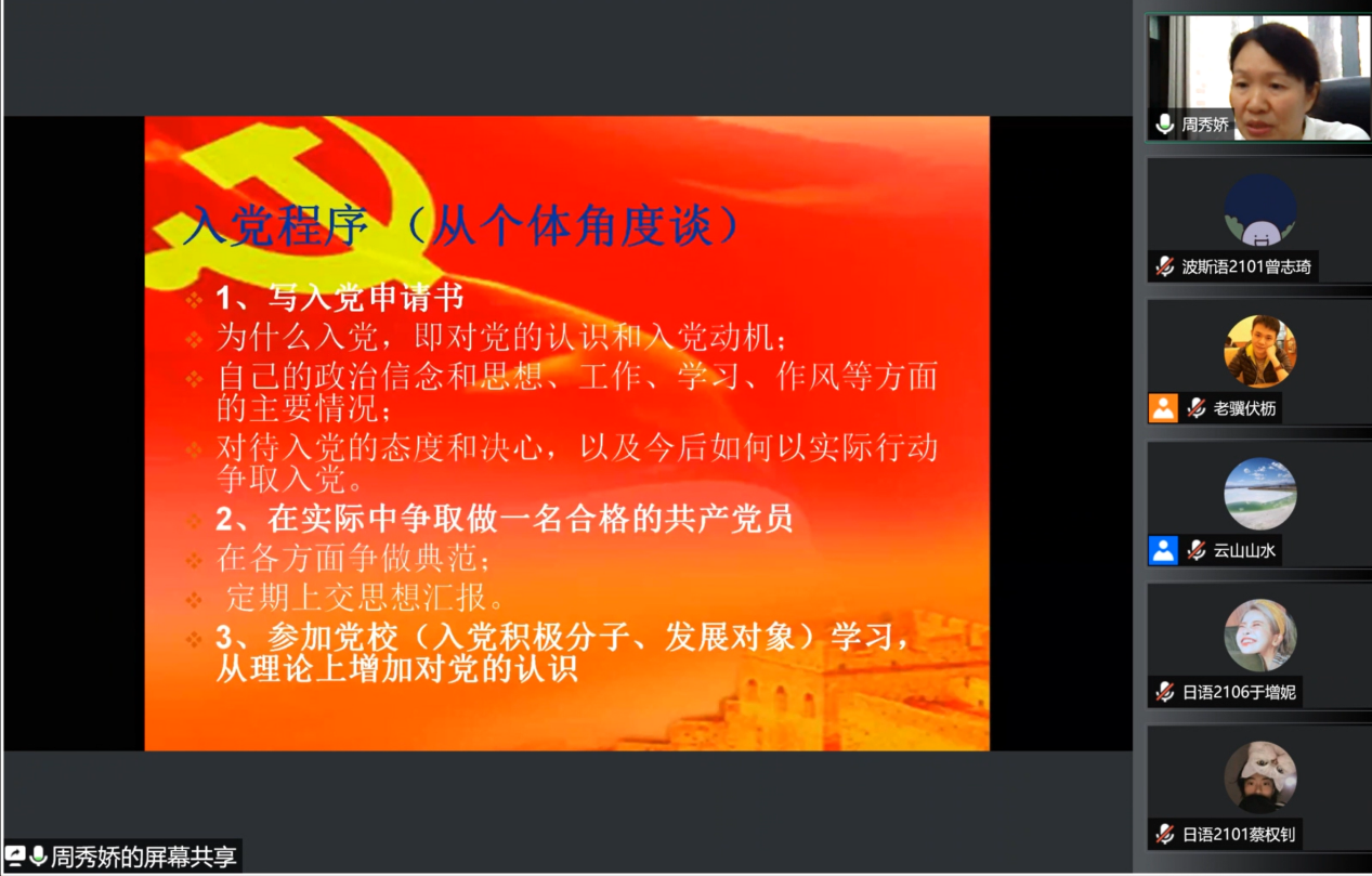 本网讯 为做好在2021级新生中发展党员工作,2021年9月9日上午,日语学院、亚非学院(筹)通过线上平台在2021级全体新生中开展入党知识专题宣讲。宣讲会由学院党委书记周秀娇主讲,学院党委副书记曾智鹏主持。