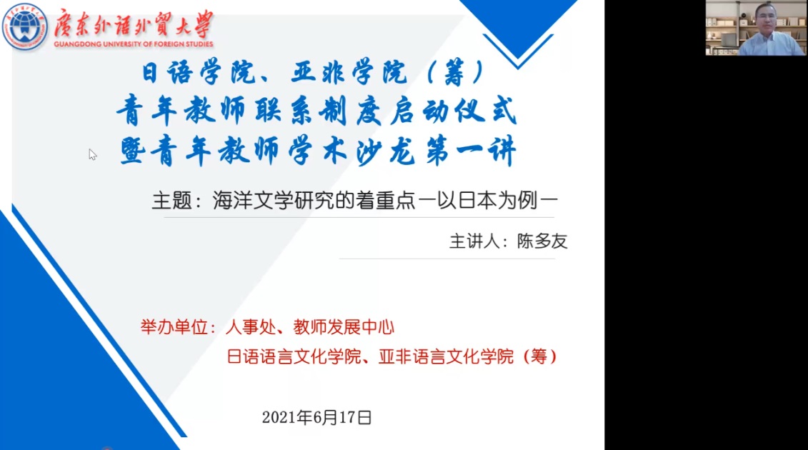 6月17日下午,日语学院、亚非学院(筹)青年教师联系制度启动仪式暨青年教师学术沙龙第一讲在线成功举办,学院全体院领导、党员学科带头人、35岁以下青年教师共36人参加,学院副院长张志刚主持活动。本次活动得到学校人事处、教师发展中心的大力支持,学校人事处、教师发展中心丁旋旋老师到会指导。