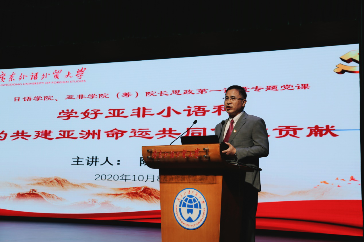 陈多友院长以“学好亚非小语种,为共建亚洲命运共同体做贡献”为主题,以习近平总书记在2019年5月15日在亚洲文明对话大会上所作的题为《深化文明互鉴 共建亚洲命运共同体》的重要讲话入手,结合社会经济发展实际需求,阐释了学好亚非小语种的重要性、必要性以及战略意义。以开放、包容、发展的视角,引导新生要在专业学习中积极响应国家号召,坚持美人之美,美美与共;坚持开放包容、兼收并蓄;坚持与时俱进,开放发展,为共建人类命运共同体做贡献。他结合具体事例,分析了学习好亚非小语种的方式方法,进一步引导青年学生 树立专业自信,做到博学、审问、慎思、明辨和笃行,为“一带一路”建设 、粤港澳大湾区建设做出贡献。