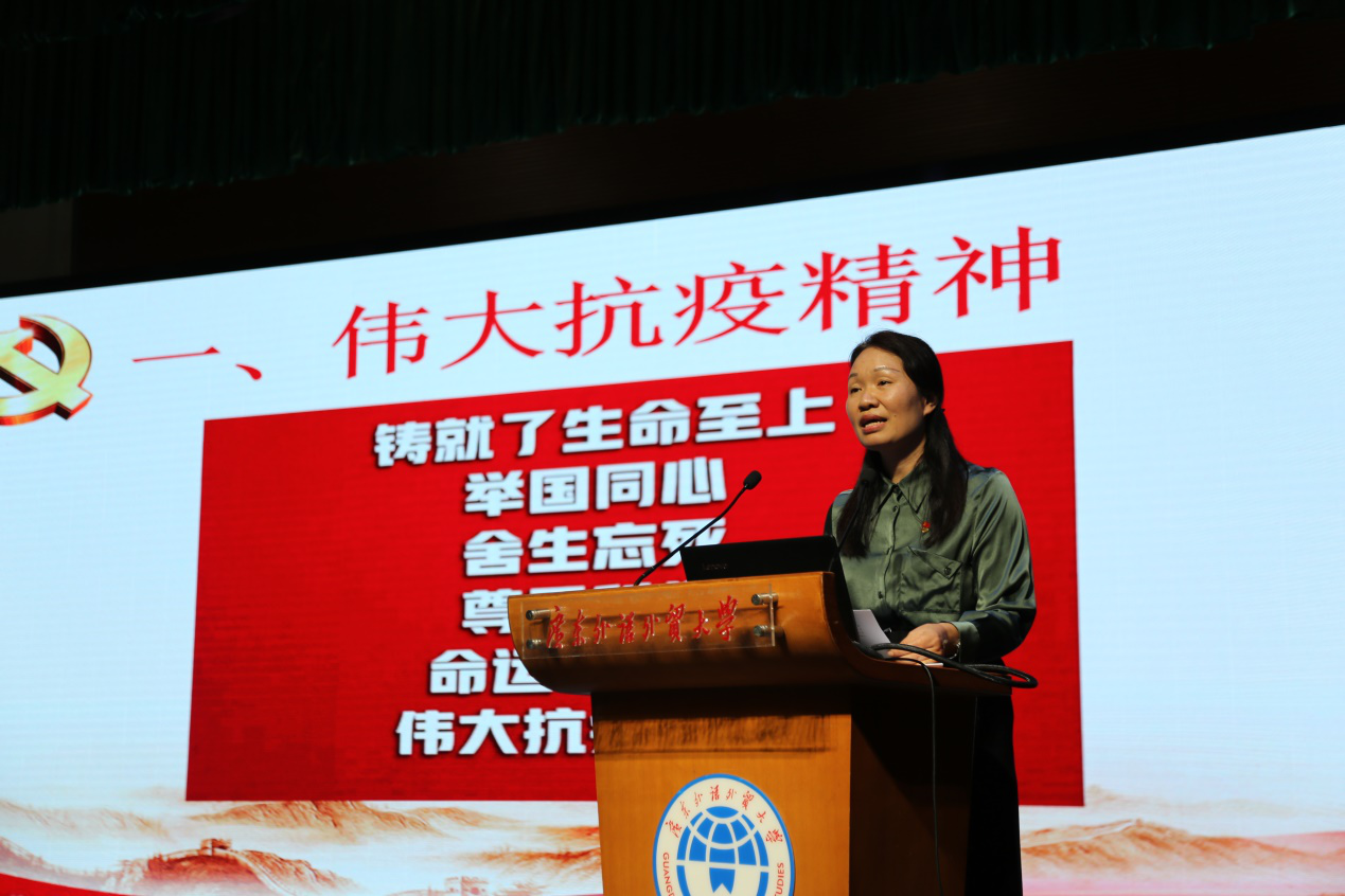 学院党委书记周秀娇以“伟大抗疫精神与青年的使命担当”为主题,从伟大抗疫精神的内涵释义开始,以生动的案例,讲述了我院青年师生在今年上半年与全国人民一起众志成城抗击新冠肺炎疫情的感人战“疫”故事。他们当中,不仅有冒着生命危险,随同中国红十字会专家队赴伊拉克开展抗疫的“90后”教师党员艾河旭,有积极支援海关口岸一线、投身社区服务的学生党员志愿者朱峰钰、吴倩颖,还有发挥专业特长以“译”战“疫”的日语、阿拉伯语以及波斯语等专业的师生团队……,这些身边鲜活的抗疫故事,充分彰显了我院师生甘于奉献的精神和勇于担当的品格。她引导青年学子要学习和弘扬伟大的抗疫精神,以坚定的理想信念坚守初心,以不懈的奋斗精神担当使命,以实现中华民族伟大复兴为己任,勇担时代使命,把个人理想追求融于党和国家事业中,让青春在党和人民最需要的地方绽放绚丽之花。