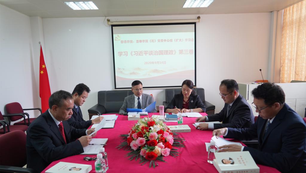 为深入学习宣传贯彻习近平新时代中国特色社会主义思想,学深悟透《习近平谈治国理政》第三卷的精髓要义,9月14日下午,日语学院、亚非学院(筹)党委在学院会议室召开党委中心组(扩大)学习会,集中学习《习近平谈治国理政》第三卷。学院党委委员、班子成员、教工党支部书记、系(办)主任、全体辅导员参加此次学习会。