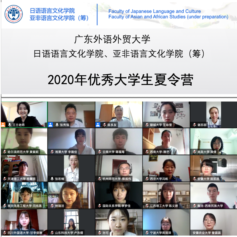 20日上午,日语语言文化学院、亚非语言文化学院(筹)2020年优秀大学生夏令营开营仪式举行。开营仪式由副院长张秀强教授主持,首先由院长陈多友教授致欢迎辞,其后副院长张秀强向营员们介绍了学院研究生培养特色,研究生办公室主任王兰副教授介绍了学院的研究生国际交流项目并解答了营员的问题。师生还进行了线上纪念合影。