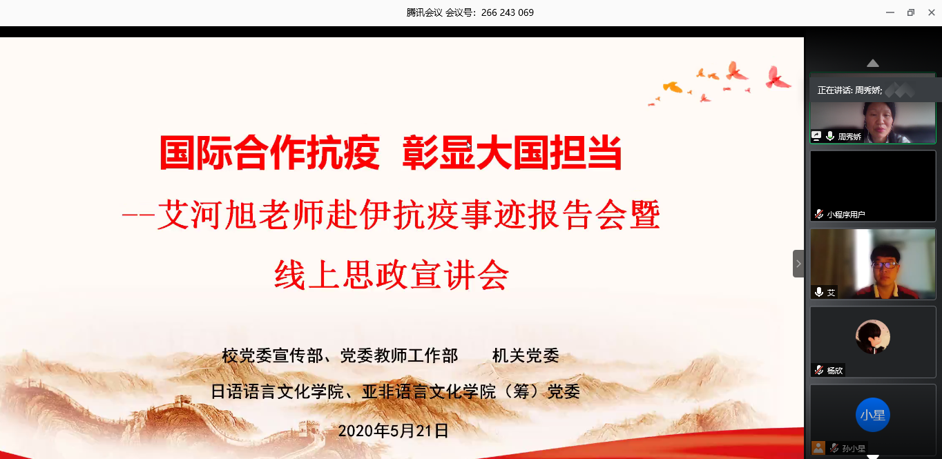 本网讯5月21日下午,我校教师艾河旭赴伊抗疫事迹报告会暨线上思政宣讲线上举行,党委宣传部、党委教师工作部为艾河旭颁发思政宣讲团“国际合作抗疫彰显大国担当”专题特聘宣讲员证书。活动由党委宣传部、党委教师工作部,机关党委,日语语言文化学院、亚非语言文化学院(筹)党委主办,近300名师生党员参加线上活动。校党委常委、副校长王廷惠出席会议。