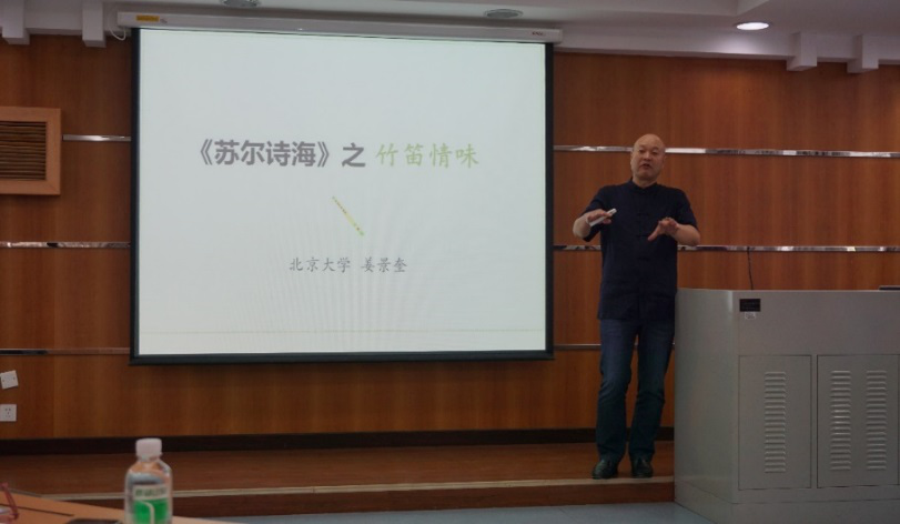 聘书颁发仪式后,姜景奎教授主讲了题为“苏尔诗海之竹笛琴味”的讲座。姜景奎教授选取该诗歌集中与竹笛相关的诗歌,基于翻译研究,赏析苏尔达斯的竹笛情味。讲座幽默风趣,内容引人入胜。此次讲座加深了师生们对印地语巨著《苏尔诗海》的了解,提高了学生学习语言和相关文学知识的兴趣。来自我院印地语、乌尔都语、孟加拉语等多个专业的师生认真聆听了本次讲座。