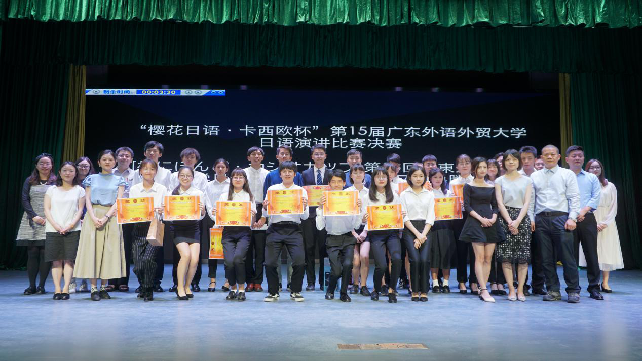 本网讯 11月2日,第十五届广东外语外贸大学“卡西欧”杯日语演讲比赛决赛在六教报告厅拉开帷幕。经过两轮激烈的角逐,阳彬彬同学和郑佩纯同学脱颖而出,分别获得新人组和大奖组的一等奖。
