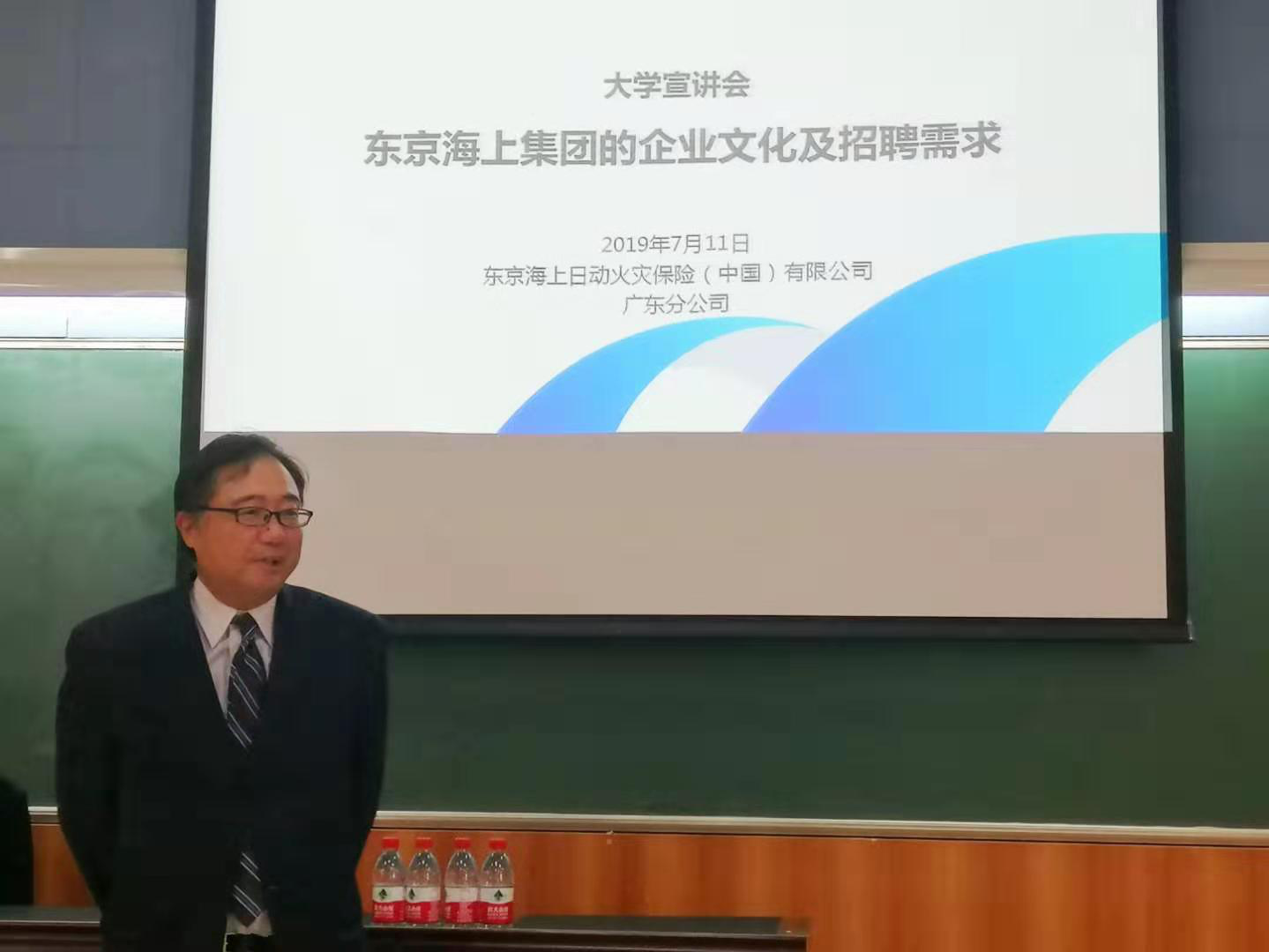 接下来,东京海上集团(广东)总经理石原徹弥先生对东京海上集团进行了详细的介绍。石原徹弥先生幽默风趣地介绍了财产保险的概念,让同学们对财产保险有了更深刻的理解。随后,他对东京海上集团的企业文化与企业理念进行了深刻的阐述。2011年东日本大地震发生后,数以万计的人失去了家园,甚至失去了生命。石原徹弥先生谈到,在那样的天灾人祸发生后,公司没有办法去救助去治疗任何人,他们所能做的只有尽快将保险金发给人们,以解决他们的燃眉之急,让他们还能重燃生活的希望。而这,就是东京海上集团存在的社会意义。