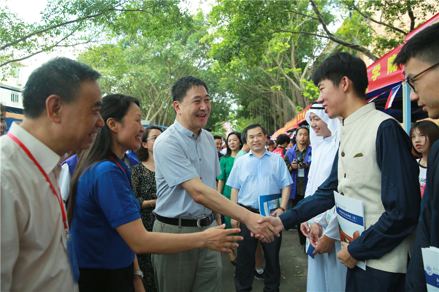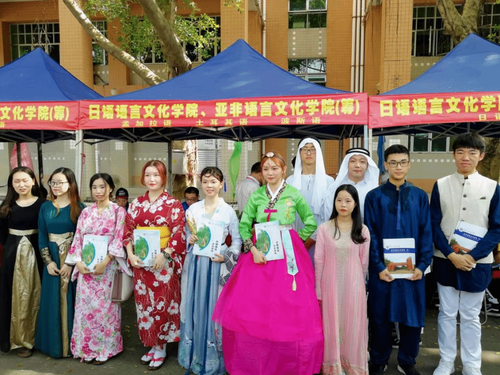 身着语言对象国服饰迎接考生和家长