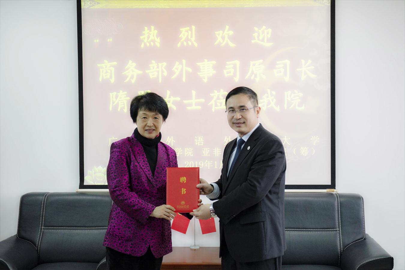 本网讯 2019年1月5日,我校杰出校友,原联合国工业发展组织执行干事、原商务部外事司司长隋翚女士莅临我院指导工作。