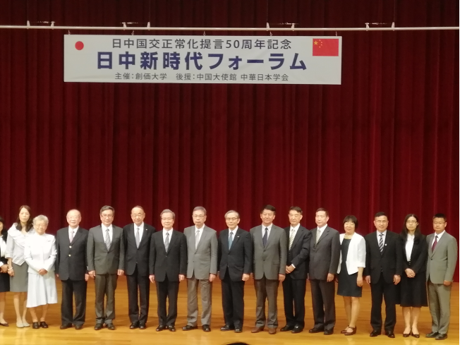 本网讯:9月8日,应日本国创价学会暨创价大学邀请,中国中华日本学会代表团一行15人访日,并出席中日邦交正常化倡言50周年纪念大会——中日新时代论坛。当日上午10时大会在创价大学本部大楼国际会议厅拉开序幕。开幕式上,代表团团长中国社会科学院日本研究所所长、全国政协委员高洪研究员,创价大学校长马场善久教授,中国社会科学院日本研究所党委书记刘玉宏研究员分别致辞。复旦大学原党委副书记王荣华教授、东日本国际大学客座研究员西园寺一晃教授、北京大学日本研究中心贾蕙萱教授以及创价大学和平问题研究所玉井秀树教授分别作基调演讲。论坛由创价大学主办,中华人民共和国驻日本国大使馆与中华日本学会为指导单位。来自中日两国高校及研究机构的150余名学者与会。