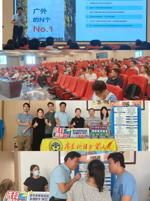 同一时间,教务部通识科陈北青、日语学院全优教授及日本语言文学系系主任辛暨梅,日语学院教授王兰、讲师迟皎洁分别前往广州市实验外语学校、广州市第十六中学进行招生宣传,为考生提供优质咨询服务。老师们围绕学校的办学特色、招生亮点、专业组设置情况等进行宣讲,重点宣传了双学士学位专业和“亚洲校园计划”等创新班的最新政策。宣传小组热情地向考生和家长提供志愿填报咨询,鼓励考生结合自身专长和兴趣选择广外,切实有效的推进了招宣工作,增进了学生对广外的了解。