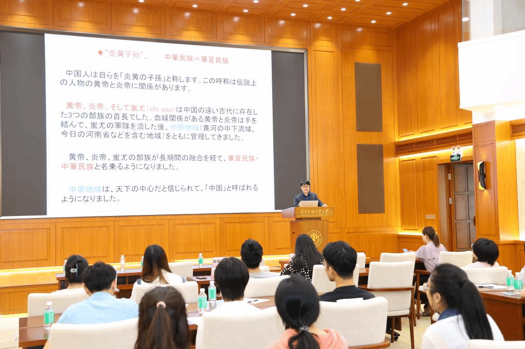 在讲座环节,邓宇阳以“中国的古代史、地理、风景”为题,为中日学生带来了一场妙趣横生的讲座。他通过丰富的图片资料以及生动的讲述,向中日学生展示了中国悠久的历史文化和壮丽的自然风光,引发了现场学生的浓厚兴趣。