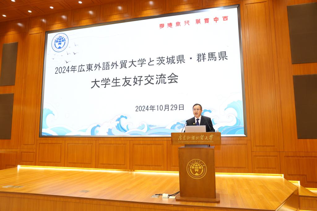 陈多友代表日语语言文化学院致辞。陈多友回顾了广东外语外贸大学日语专业的发展历程以及发展成果,并寄语在场的青年学子,希望他们能够成为中日友好的桥梁和纽带,共同为两国的繁荣与发展贡献力量。