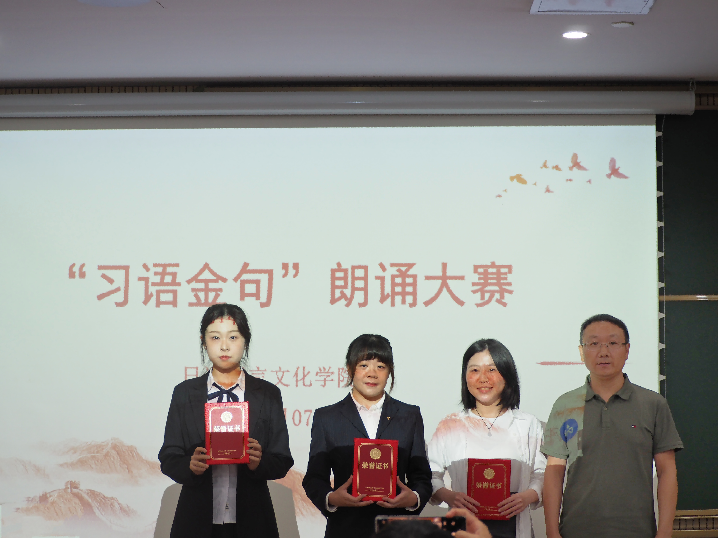 此次比赛选用《习近平谈治国理政》日文版作为朗诵语料库,选手选取书中讲话金句,包括党的建设、经济发展、文化自信、教育以及对青年的嘱托等各个方面的内容,通过日语朗诵的形式进行展示。来自不同年级的十四名选手以清晰的发音、流畅的表达朗读“金句”,字字铿锵、句句振奋,展示了日语学子的自信与实力。经过激烈的比赛,共评选出一等奖3名,二等奖5名,三等奖6名。