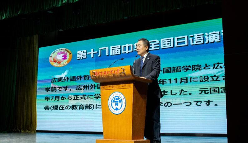 广东外语外贸大学党委常委陈彦辉出席活动并致开幕辞,对与会各方嘉宾、评审委员、参赛选手致以诚挚的问候,向主办方、协办方表示衷心感谢。陈彦辉介绍了我校的基本情况、办学特色以及广外日语专业的发展历程,同时指出本赛事是国内日语界最具影响力的赛事之一,旨在增进中日两国人民情谊,强化相互理解,激发我国大学生日语研习热忱。他鼓励各位选手能够在这个舞台上把握机会,展现自我,锤炼本领,为推动中日友好往来积蓄正能量。