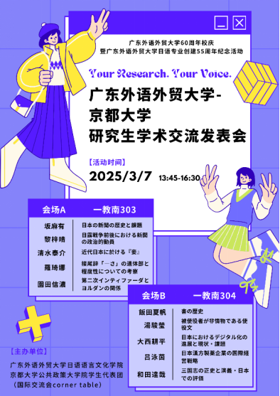 3 月 7 日,广东外语外贸大学日语语言文化学院携手日本京都大学公共政策大学院研究生,在白云山校区举办“广东外语外贸大学—京都大学研究生学术交流发表会”,这是为庆祝广东外语外贸大学 60 周年校庆暨广东外语外贸大学日语专业创建 55 周年而精心策划的纪念活动。