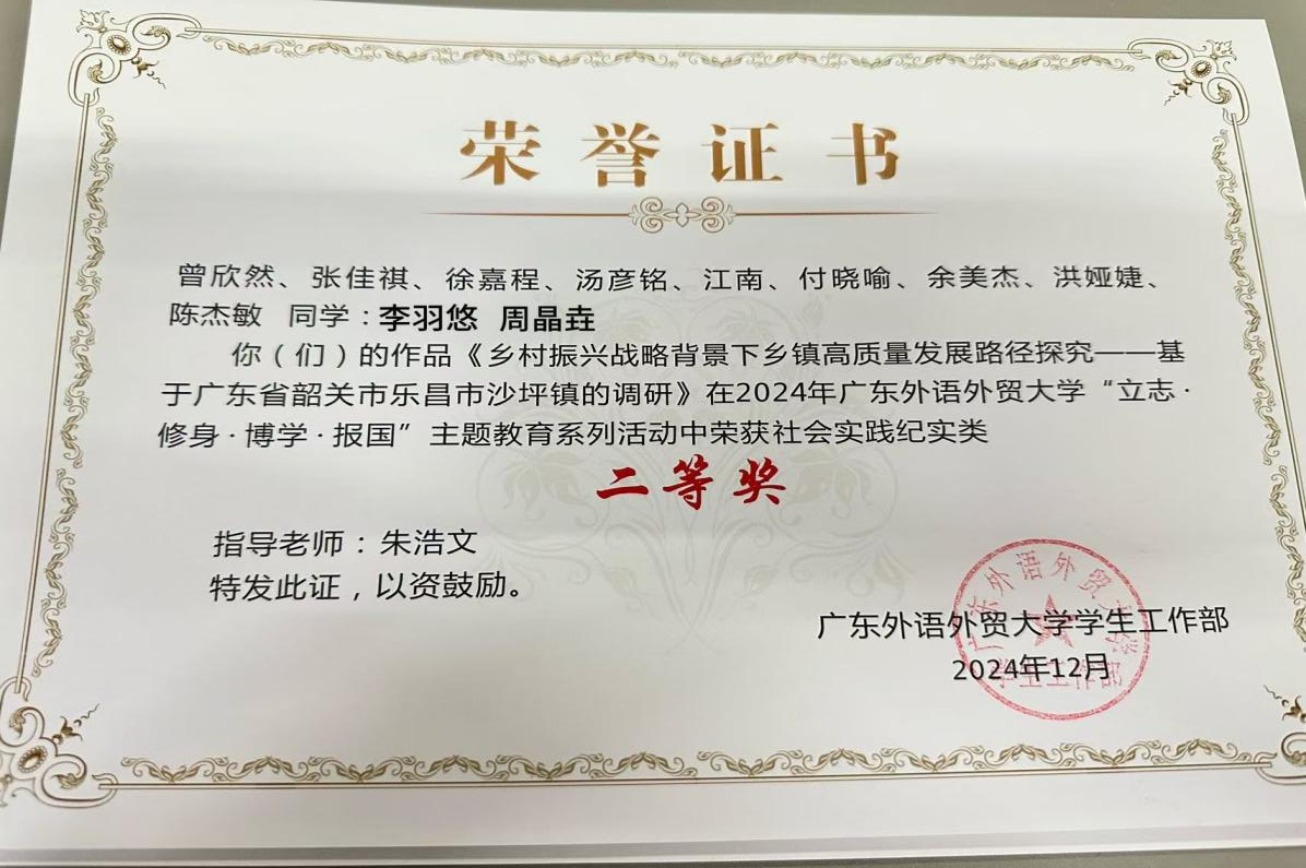 “坪”步青云团队获广东外语外贸大学“立志·修身·博学·报国”主题教育系列活动社会实践纪实类二等奖