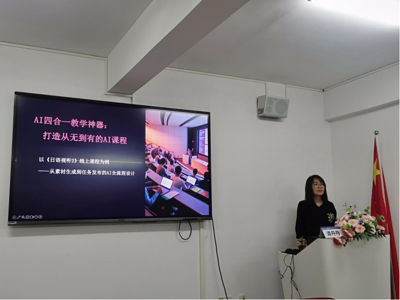 第三讲主讲人为我院教师谭丹丹老师。她以“AI四合一教学神器,打造从无到有的日语听力线上课程”为题,聚焦系列讲座的“语言”模块,对话人工智能与二语习得,结合教学实际,将Deepseek、Perplexity、ChatGPT、Google AI Studio、Magic School等人工智能工具整合于“预习”“课堂”“复习”的纵向教学时间轴之中,并进一步以具体课文为例,指导现场师生完成课前音视频生成到课后习题布置的教学设计全流程,是一场具有前瞻性、科学性、实操性的讲座。