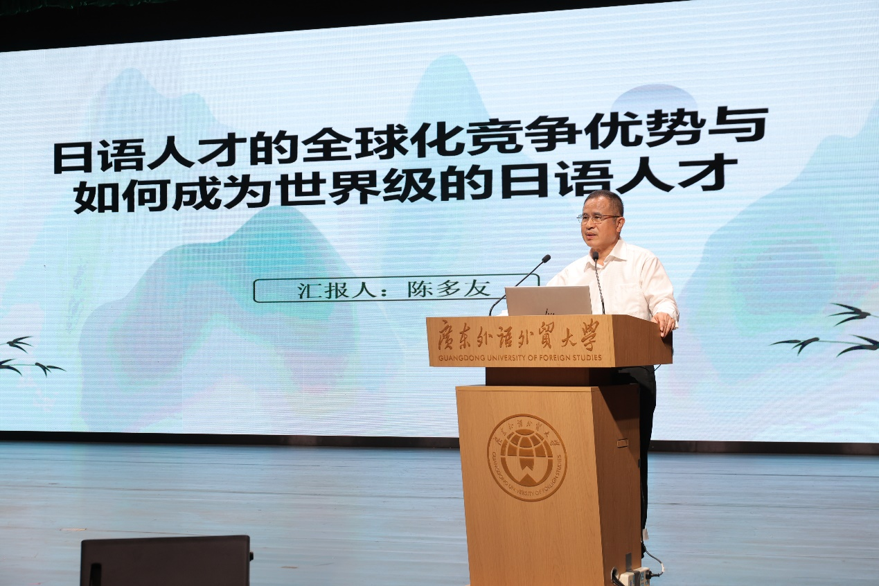 在新生入学教育环节,学院名誉院长陈多友教授为同学们作了以“日语人才的全球化竞争优势与如何成为世界级的日语人才”为主题的专业教育。他从日语人才的需求状况、日语人才的全球化竞争优势和如何成为世界级日语人才等多个角度为同学们分析了当下日语的使用情况和未来发展趋势。陈院长认为,中国的开放需要外语人才,人类的文明共建必须有卓越的外语人才发挥积极作用。他指出全球化时代不仅需要掌握语言技能,还需要具备全球化视野,勉励同学们成为一个具备对不同文化社会理解、尊重和适应能力的世界级日语人才。