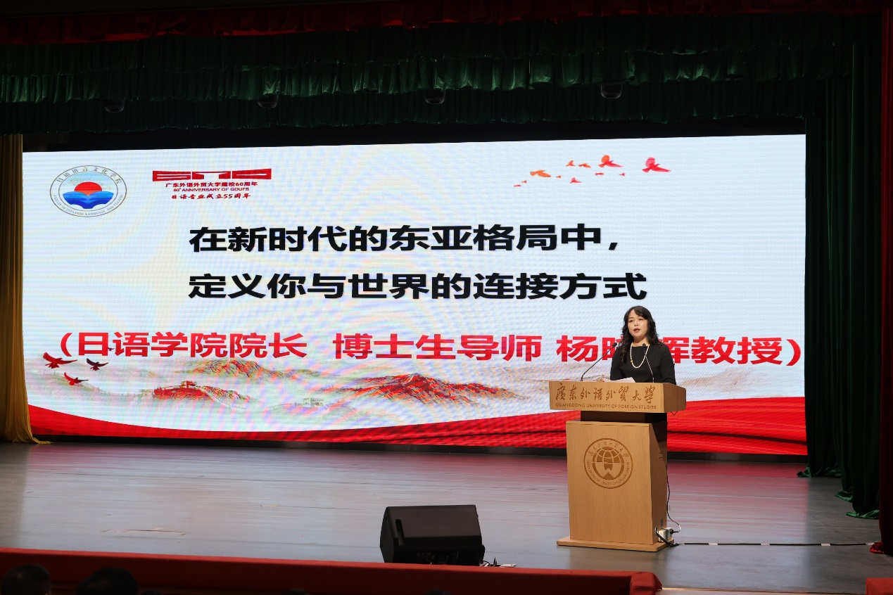 开学典礼在庄严的国歌声中拉开序幕。院长杨晓辉教授代表学院致辞,她向2025级全体新生表示热烈欢迎,并以“在新时代的东亚格局中,定义你与世界的连接方式”为主题,深入阐述了当前东亚地区的独特魅力与挑战。她谈到,我们身处的东亚,是当今世界最具活力、也最具复杂性的地区之一;这里,深厚的历史渊源与现实的利益格局相互交织;紧密的经济合作与激烈的产业竞争并行不悖;深刻的文化共鸣与复杂的国际博弈同台上演。在这样一幅宏大而生动的时代画卷中,世界需要的,早已不是一个单纯的“语言翻译者”。面对RCEP框架下的区域经济一体化浪潮和全球产业链的深度重构,时代迫切呼唤的,是既精通语言,又深谙区域经济、社会文化肌理,能够在一线驾驭复杂跨国事务的“知日”精英。杨晓辉院长通过分享选择日语专业的初心,以及对“语言是什么”这一问题的深刻回答,向同学们强调了东亚复合型人才培养的重要性。基于对语言真谛的理解,她希望同学们在未来的四年里,将自己塑造为具备三重角色的复合型人才——精准的沟通者、深刻的洞察者,以及积极的建设者。同时,她还向大家提出“德智体美劳”五位一体的全面发展期望,鼓励同学们在专业学习之外,注重道德修养、智力拓展、体质锻炼、美育熏陶与劳动实践的全面均衡。最后,杨晓辉院长祝愿同学们在日语学院收获知识、能力、友谊与智慧,期待在四年后见证每一位同学的蜕变与辉煌。