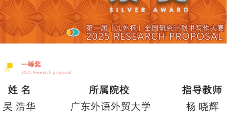 近日,第二届「九外杯」全国研究计划书写作大赛获奖名单正式揭晓,我院吴浩华同学荣获全国一等奖。这是我院继首届大赛斩获佳绩后,再次在该项赛事中拔得头筹,充分彰显了学院在拔尖创新人才培养与跨学科研究指导方面的雄厚实力。