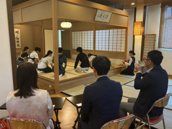 渊上正悟领事一行首先前往我院茶室参观。我院师生现场展示了传统茶艺流程,展现了茶道的典雅韵味。嘉宾们认真观摩茶艺课程,细细品尝香茗,并不时与师生交流询问茶叶品类、冲泡技巧等问题。