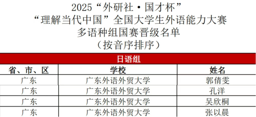 2025年“外研社·国才杯”“理解当代中国”全国大学生外语能力大赛广东省赛区圆满落下帷幕。我院四名同学在多语种组日语组比赛中表现优异,凭借扎实的语言功底与全面的综合素养,脱颖而出,成功晋级全国总决赛。