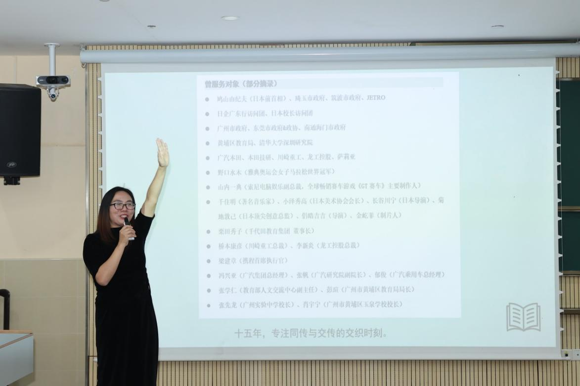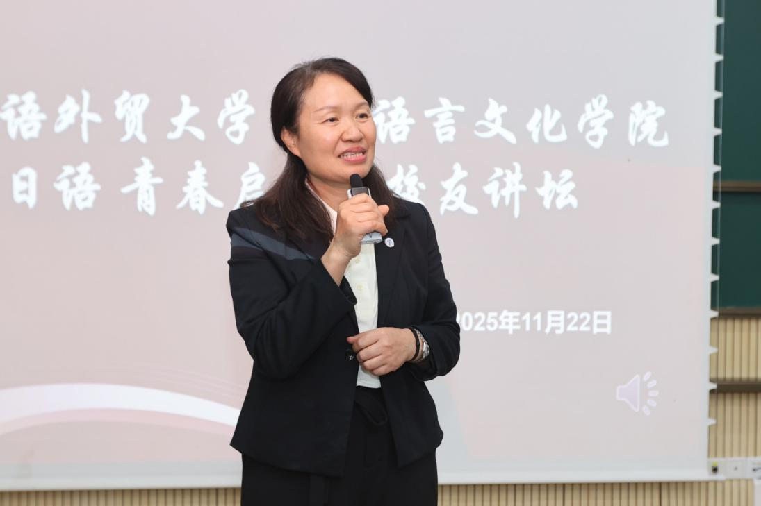 向艳红校友以“日语实践与成长路径”为题,分享了她作为全职翻译的丰富经验与在不同行业间自如切换的实践心得。她强调,深厚的日语功底是应对各类挑战的基石,让她得以从容穿梭于多元的职场环境。她鼓励同学们要对日语专业充满信心,这门专业所赋予的精准表达能力、跨文化理解力和深度学习的素养,是能够在任何领域构建核心竞争力的宝贵财富。
