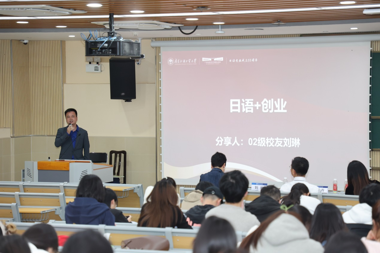 刘琳校友以“日语+创业”为主题,分享了如何利用语言优势发掘市场机会的实践经验。通过生动的创业案例,他解析了创业路上的“困局”与“破局”,强调保持学习、拓宽边界、广结良友的重要性,特别指出“跌倒后再爬起来的韧性”是创业者最宝贵的品质。