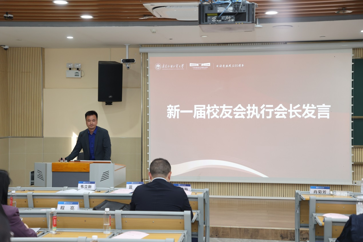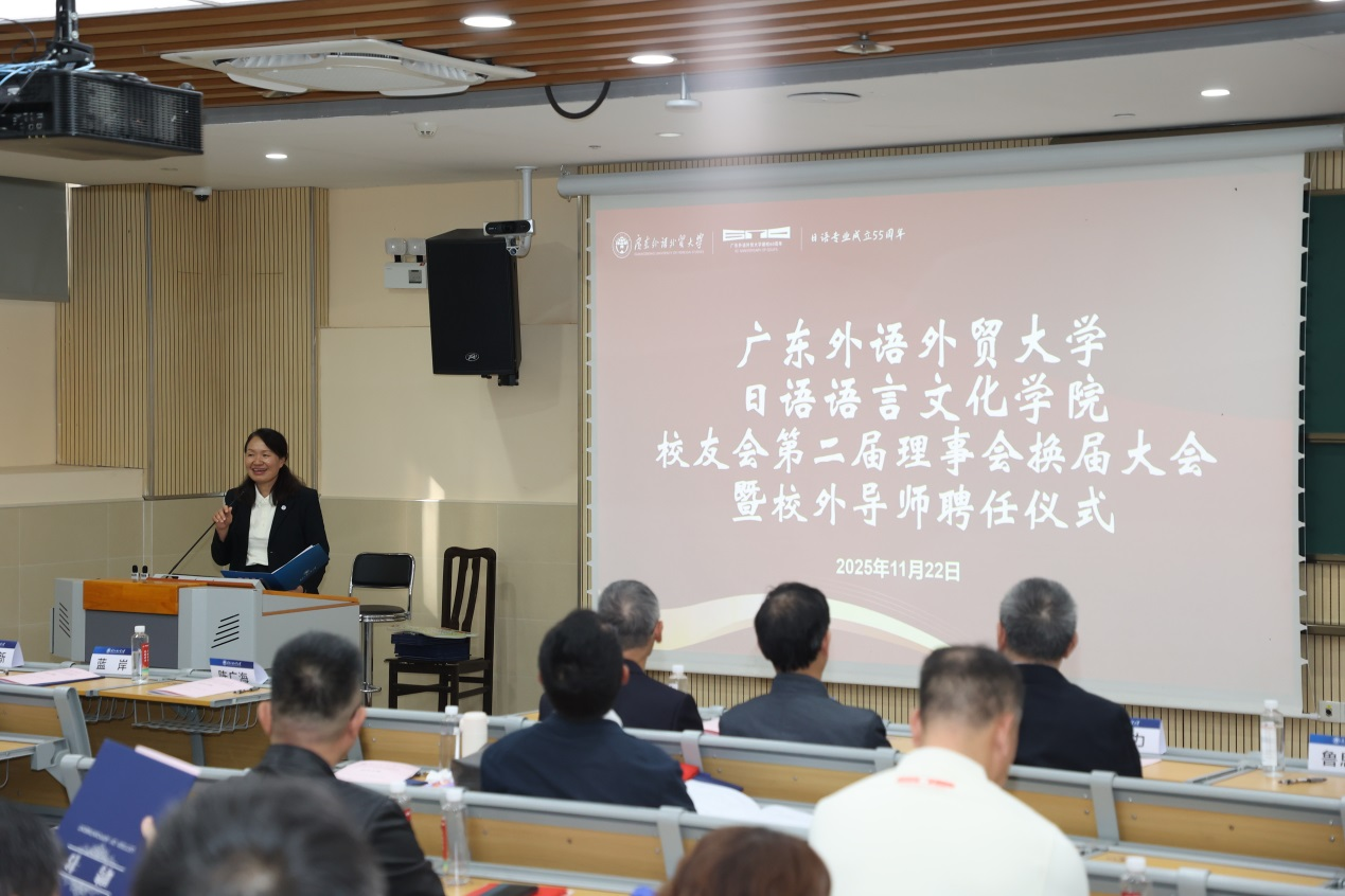 2025年11月22日,在喜迎广东外语外贸大学建校60周年华诞之际,来自海内外校友代表重返母校,共庆华诞。在这个喜庆的日子里,日语学院在一教109室举办了校友会第二届理事会换届大会暨校外导师聘任仪式,在学院文化长廊举行了校友捐赠揭幕仪式。学院领导班子全体成员、系主任、辅导员与返校校友代表参加。活动由学院党委周秀娇书记主持。