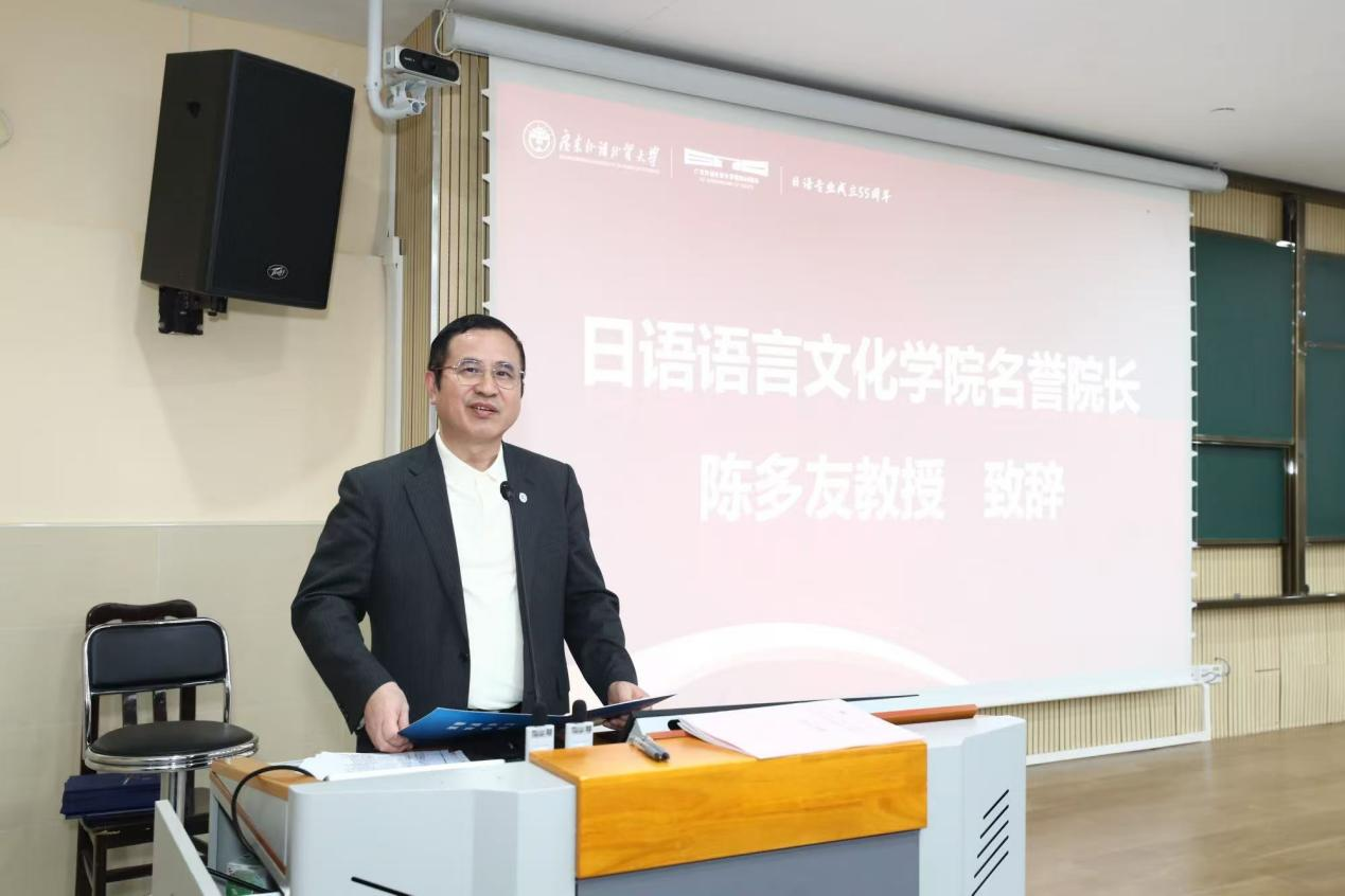 换届大会暨校外导师聘任仪式在热烈掌声中拉开帷幕。日语学院名誉院长陈多友教授致辞,他向校友们的到来表示热烈欢迎,同时深情回顾了学院秉持“开放包容、追求卓越”的办学理念以及55年以来办学所取得的成绩。陈多友表示,学院与校友要双向奔赴、共谋发展,以学科实力赋能校友成长,以校友资源助推学科高质量发展,共同为服务国家需求和建设贡献力量。