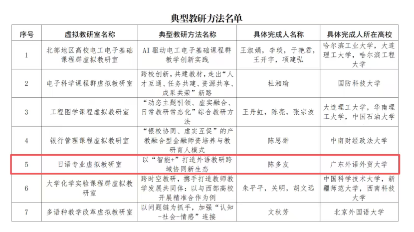 12月10日,教育部2025年度虚拟教研室试点建设典型名单正式公布。由广东外语外贸大学陈多友教授负责的日语专业虚拟教研室成功入选,凭借教研案例“以‘智能+’打造外语教研跨域教研新生态”入选典型教研方法名单。