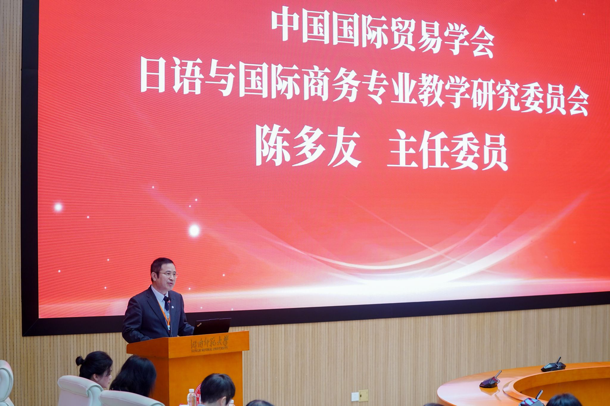 中国国际贸易学会日语与国际商务专业教学研究委员会(原中国日语教学研究会)主任委员、广东外语外贸大学日语语言文化学院(东方学研究院)名誉院长陈多友教授代表指导单位出席大会并作致辞与基调报告。