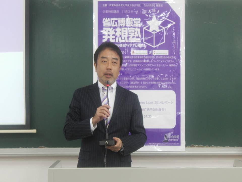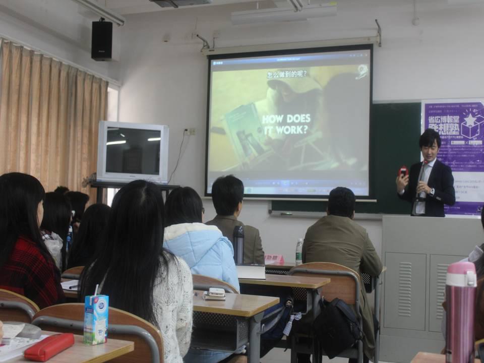本网讯 2014年12月11日下午,由云山四季组织的广东省广博报堂广告公司举办的系列讲座“发想塾”第五回在六教B208室拉开帷幕。讲座上,省广博报堂市场策划部总监高桥亘发表了精彩的演讲。省广博报堂总经理近藤充佳先生、我院日语系主任张秀强、刘劲聪老师、外教浅井治、冈泽成俊、浅井康子等出席了本次讲座。