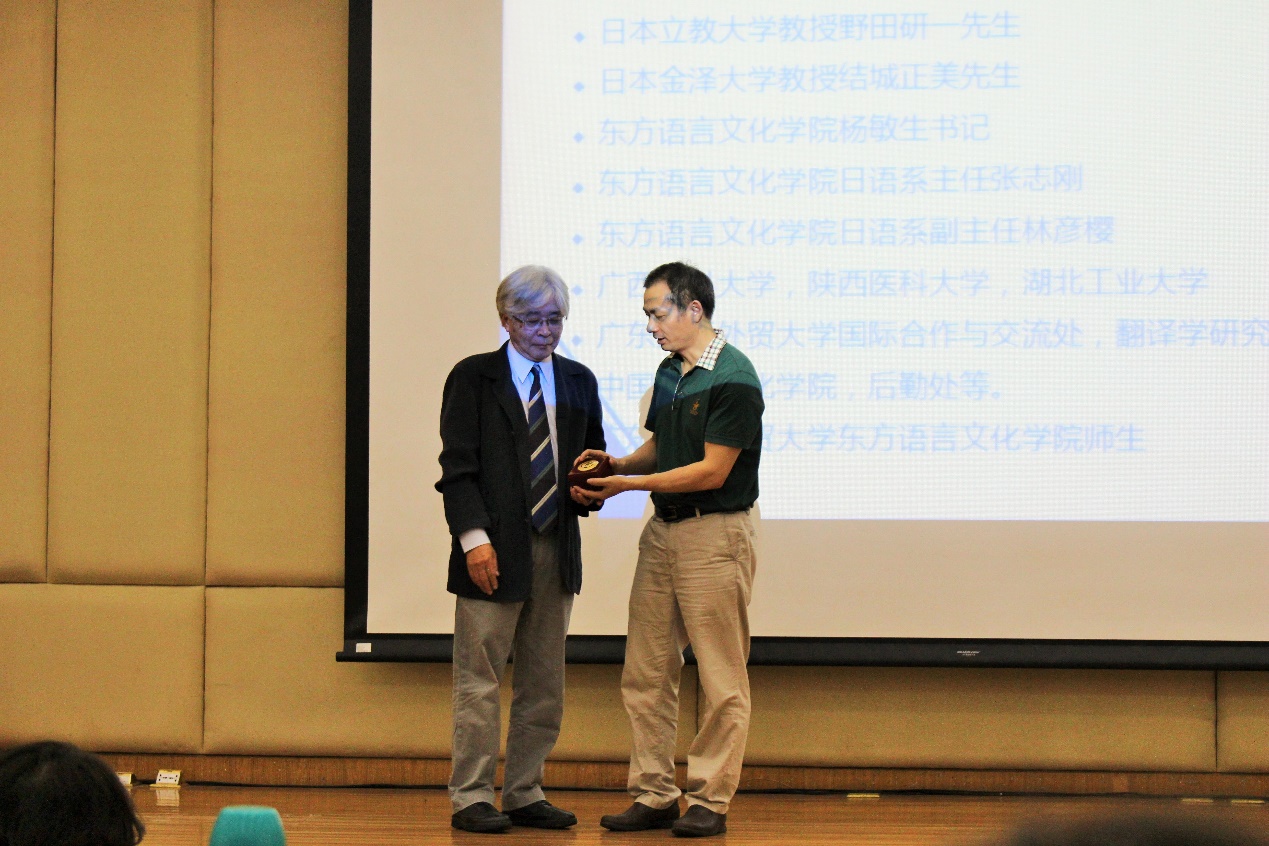 出席本次论坛的有日本文学环境学会会长、日本金泽大学教授结城正美、我校东语学院党委书记杨敏生、日语系主任张志刚,日语系副主任林彦樱,以及来自广东医药大学、山西科技大学、湖北工业大学等省内外高校和我校东语学院、国际交流与合作处、翻译学研究中心、中国语言文化学院、后勤处等相关学院和职能部门的师生。本次论坛由我校云山学者、中日比较生态文学研究所所长杨晓辉教授主持,她首先致欢迎词,紧接着杨敏生书记代表学校向野田研一教授赠送了纪念品。