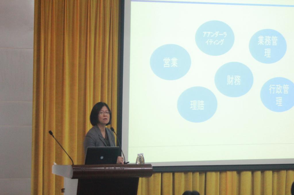 鹈饲章弘演讲结束后,他的助理刘晓玲上台进一步介绍了公司的组织架构、人才培养等方面的情况。东京海上日动公司组织架构由销售部、理赔部、财务部、行政管理部等六大部门组成,各部门分工明确、协调有序。在阐述各部门职责时,她现身说法,向同学们讲述了自己在理赔部进行保险评估工作时,探访汽车运输巨轮的故事,展现了其在东京海上日动公司的丰富的工作经历,成功引起了同学们的兴趣。