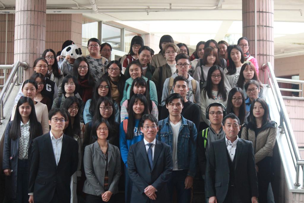 本网讯 11月10日下午,日本领事馆巡回演讲在北校区七教水上报告厅举行,本期演讲以“东京海上日动在中国的业务发展”和“东京海上日动的人才需求”为题,由东京海上日动(中国)有限公司广东分公司总经理鹈饲章弘主讲。出席本次讲座的嘉宾有:东语学院副院长张秀强、日本领事馆领事田中朝哉、秘书王小丽、日语系主任张志刚、广州日本商工会金融分科会长松永裕辉、事务员赵欢让、东京海上日动(中国)有限公司广东分公司总经理助理刘晓玲。