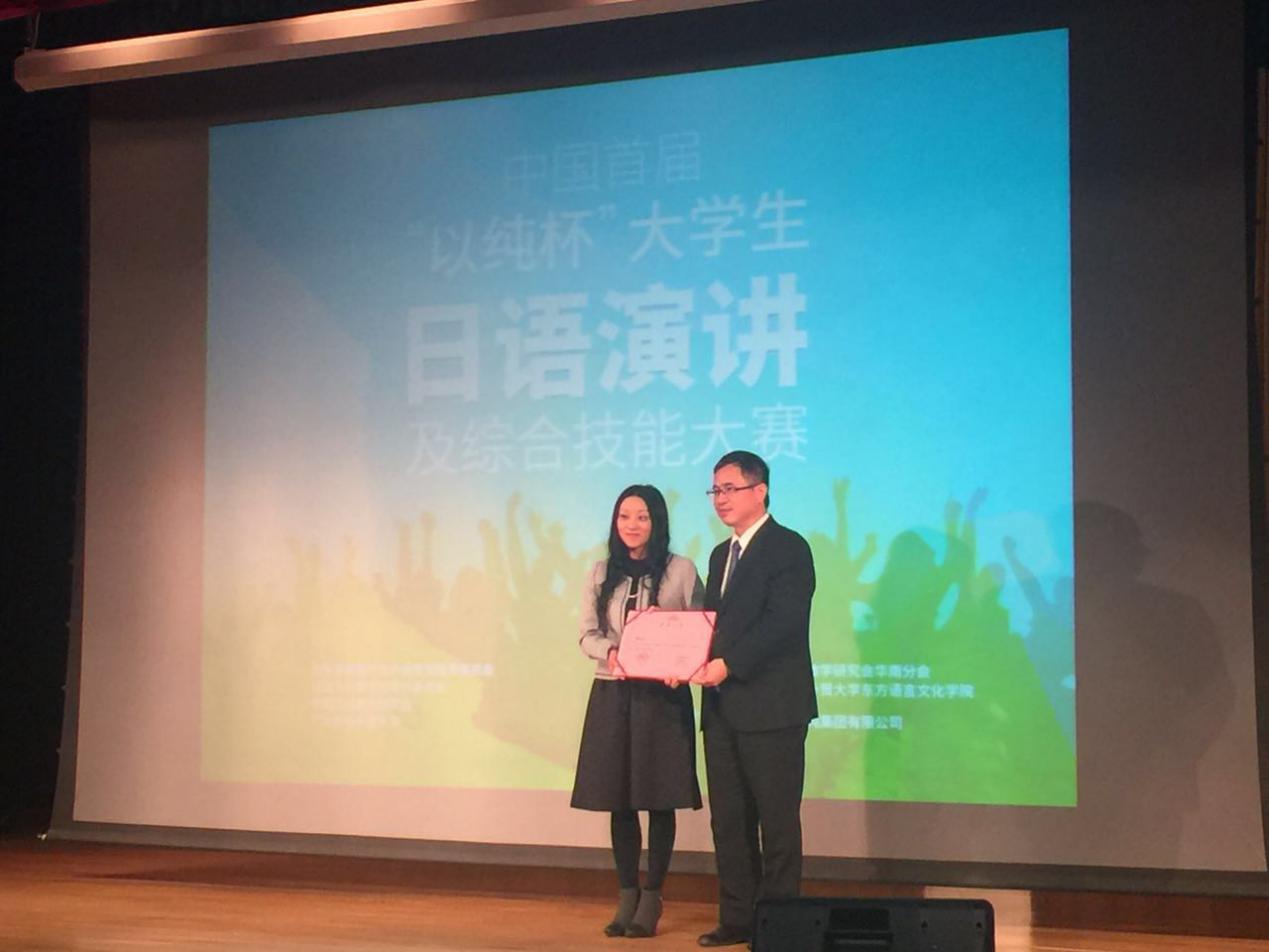 与中国日语教学研究会会长周异夫教授共同为特等奖选手颁奖