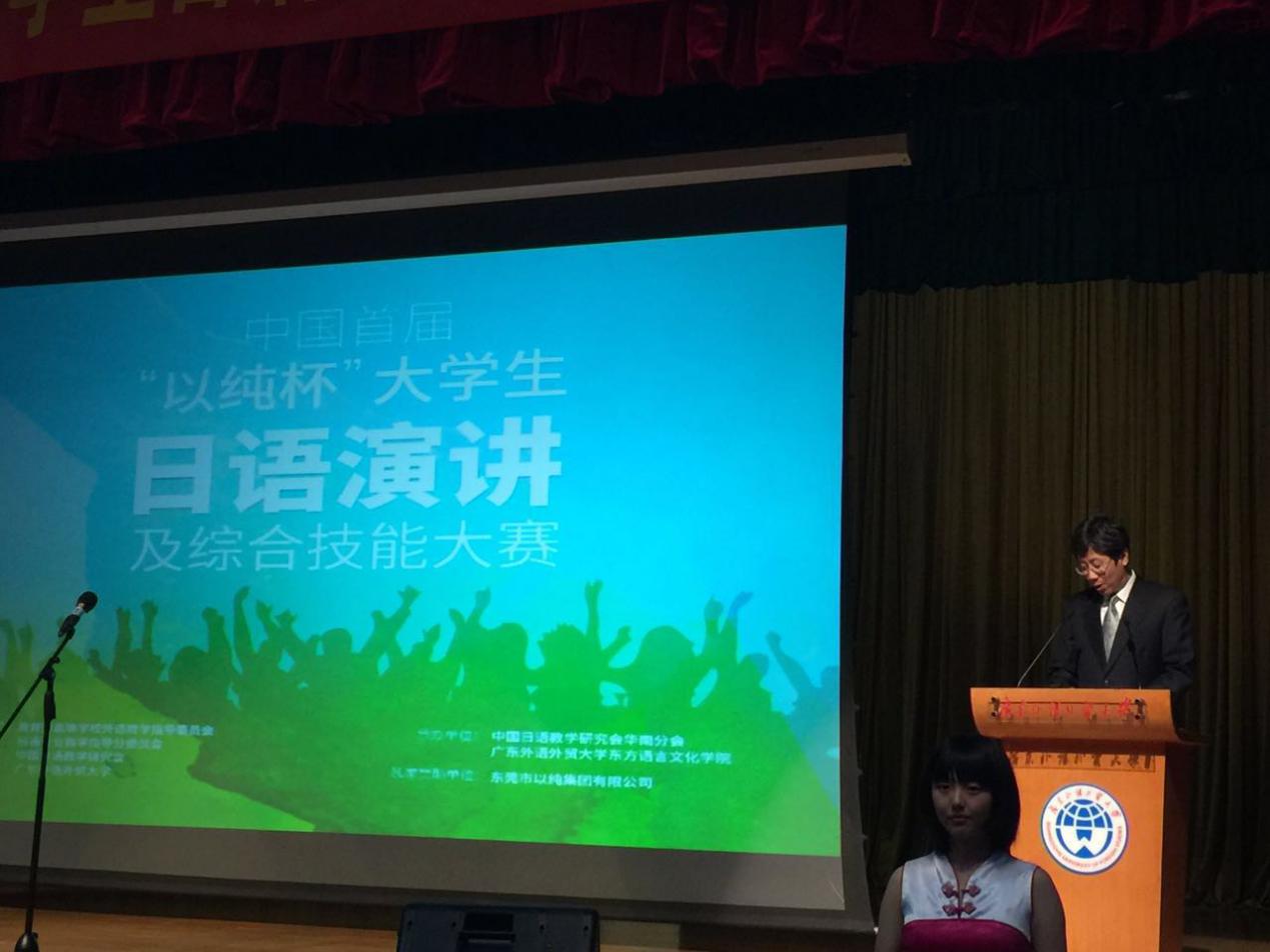 本网讯 11月27日,由教育部高等学校外语教学指导委员会日语专业教学指导分委员会,中国日语教学研究会,广东外语外贸大学主办,中国日语教学研究会华南分会、广东外语外贸大学东方语言文化学院承办,东莞市以纯集团有限公司独家赞助的全国首届“以纯杯”大学生日语演讲及综合技能大赛在我校第六报告厅成功举办。我校副校长陈林汉教授,东莞市以纯集团有限公司副董事长蓝岸先生,中国日语教学研究会会长、吉林大学外国语学院院长周异夫教授,中华日本学会会长、中国社科院日本研究所原所长李薇教授,中国日语教学研究会副会长、中国日语教学研究会华南分会会长、广东外语外贸大学东方语言文化学院院长陈多友教授,中山大学外国语学院副院长邱雅芬教授,厦门大学外文学院副院长陈端端教授,海南大学外国语学院院长金山教授、同济大学宫山昌治先生等嘉宾、评委、参赛选手、指导教师、以及部分高校师生代表出席了本次大赛。