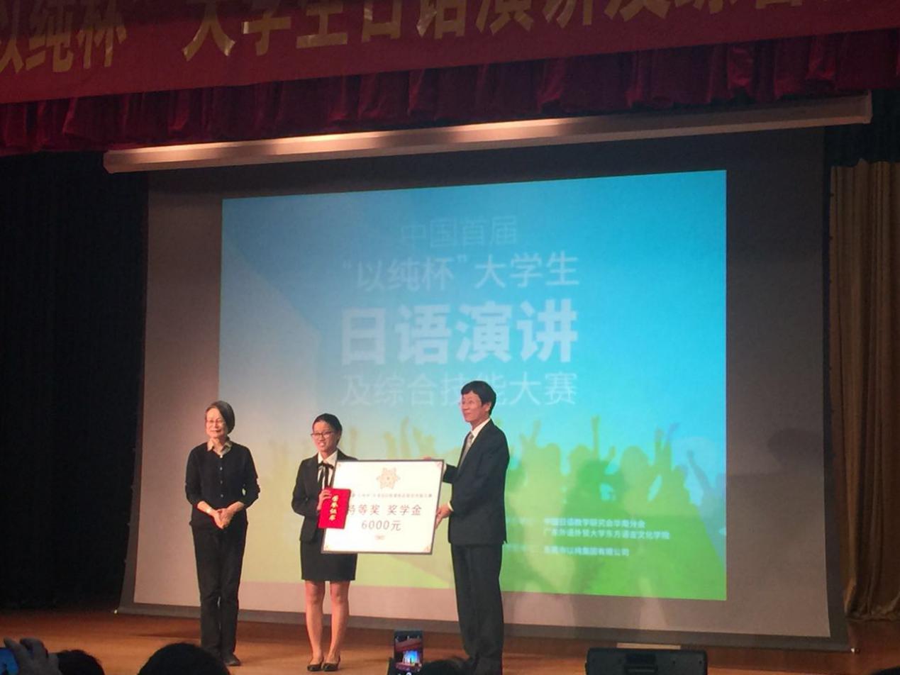 与中国日语教学研究会会长周异夫教授共同为特等奖选手颁奖