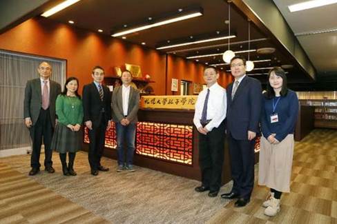 宋伍强老师和孟丁教授与札幌大学副校长兼孔子学院院长山田玲良教授(左三)及札幌大学校长助理汪志平教授(右二)等在札幌大学孔子学院办公室前合影