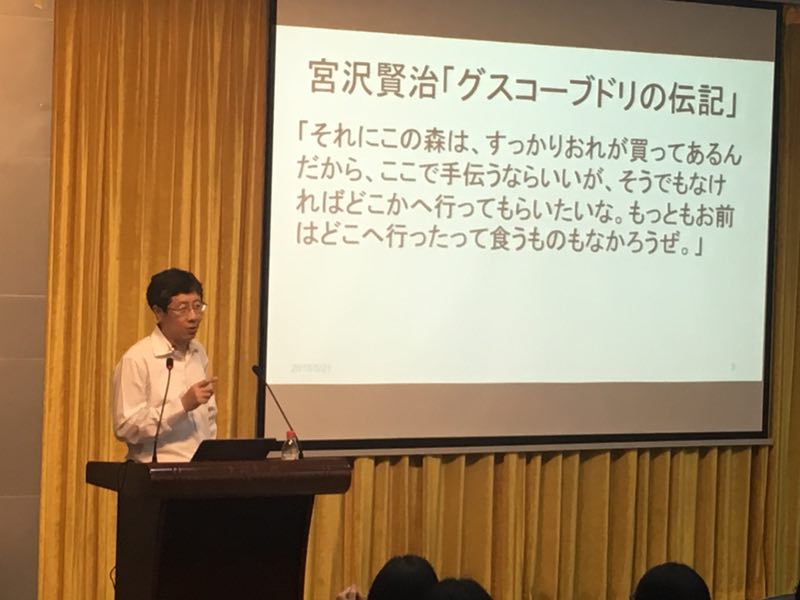 周异夫教授先以日本作家宫泽贤治的《古斯柯布多力传记》的一个片段作为切入点,讲述了明治维新时期,西方先进技术和文化对日本社会的影响,并分析了时代背景下日本文学所体现的特征。受西方的科学精神影响,日本文学界开始流行浪漫主义和自然主义,私小说这一文学体裁也随之出现。